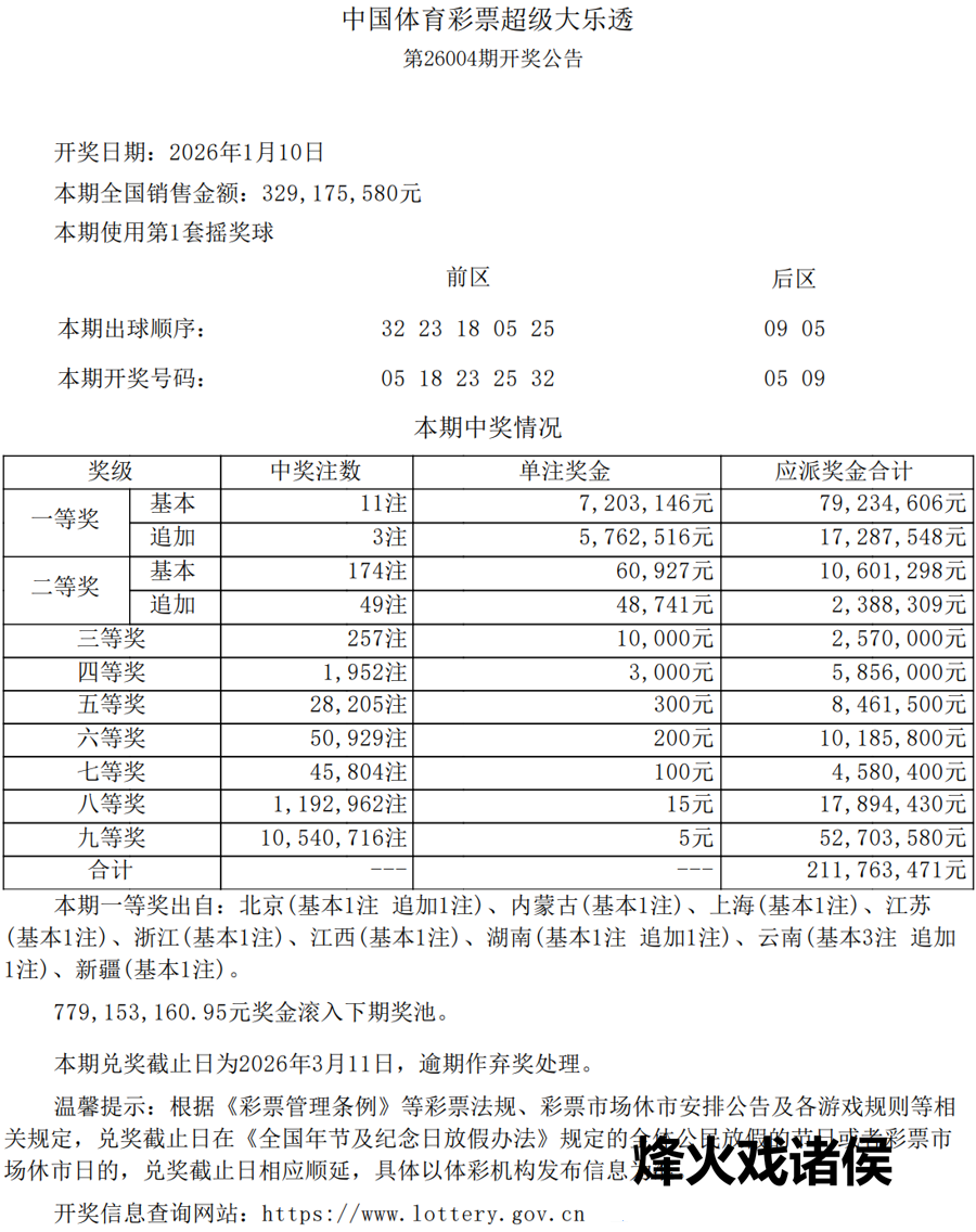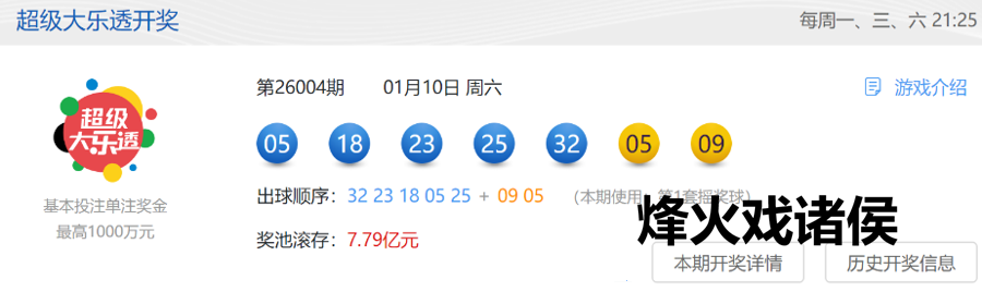 1月10日,超等大乐透第26004期开奖。前区开出号码05、18、23、25、32;后区开出号码05、09。本期世界销售3.29亿元,为国度筹集彩票公益金1.18亿元。