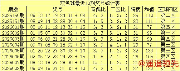 双色球第2026008期开出奖号:06 09 16 27 31 33 + 10。其中红球三区比为2:1:3,和值为122,奇偶比为4:2,跨度为27,蓝球出现在第三区。