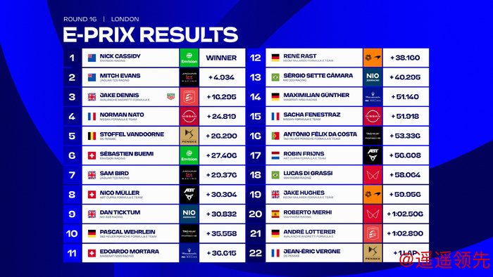 2023赛季FE电动方程式伦敦站(第16回合)在英国伦敦结束,经过一场漫长的鏖战,尼克·卡西迪拿下本赛季最后一个分站冠军!作为最早加入FE电动方程式的车队之一的远景车队加冕FE第九赛季车队世界冠军!埃文斯收获比赛亚军,丹尼斯又一次登上领奖台。